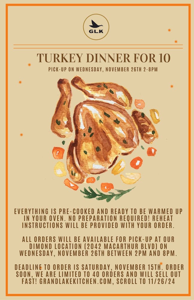 Thank you, Oakland! Thanksgiving pre-sale is over! Please email events@grandlakekitchen.com if you are still in need. We will help if we can!!